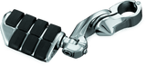 These cruise mounts with positive locking Quick Clamps offer an incredible range of adjustability. The entire assembly may be moved up or down on the engine guard. The arm and footpeg may be further adjusted along a vertical or horizontal arc. A unique clevis permits angle adjustment of the footpeg. The heavy-duty Quick Clamp and sturdy offset arm ensures that the footpegs will clear fairing lowers and will stay where you put them.
