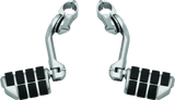 These cruise mounts with positive locking Quick Clamps offer an incredible range of adjustability. The entire assembly may be moved up or down on the engine guard. The arm and footpeg may be further adjusted along a vertical or horizontal arc. A unique clevis permits angle adjustment of the footpeg. The heavy-duty Quick Clamp and sturdy offset arm ensures that the footpegs will clear fairing lowers and will stay where you put them.